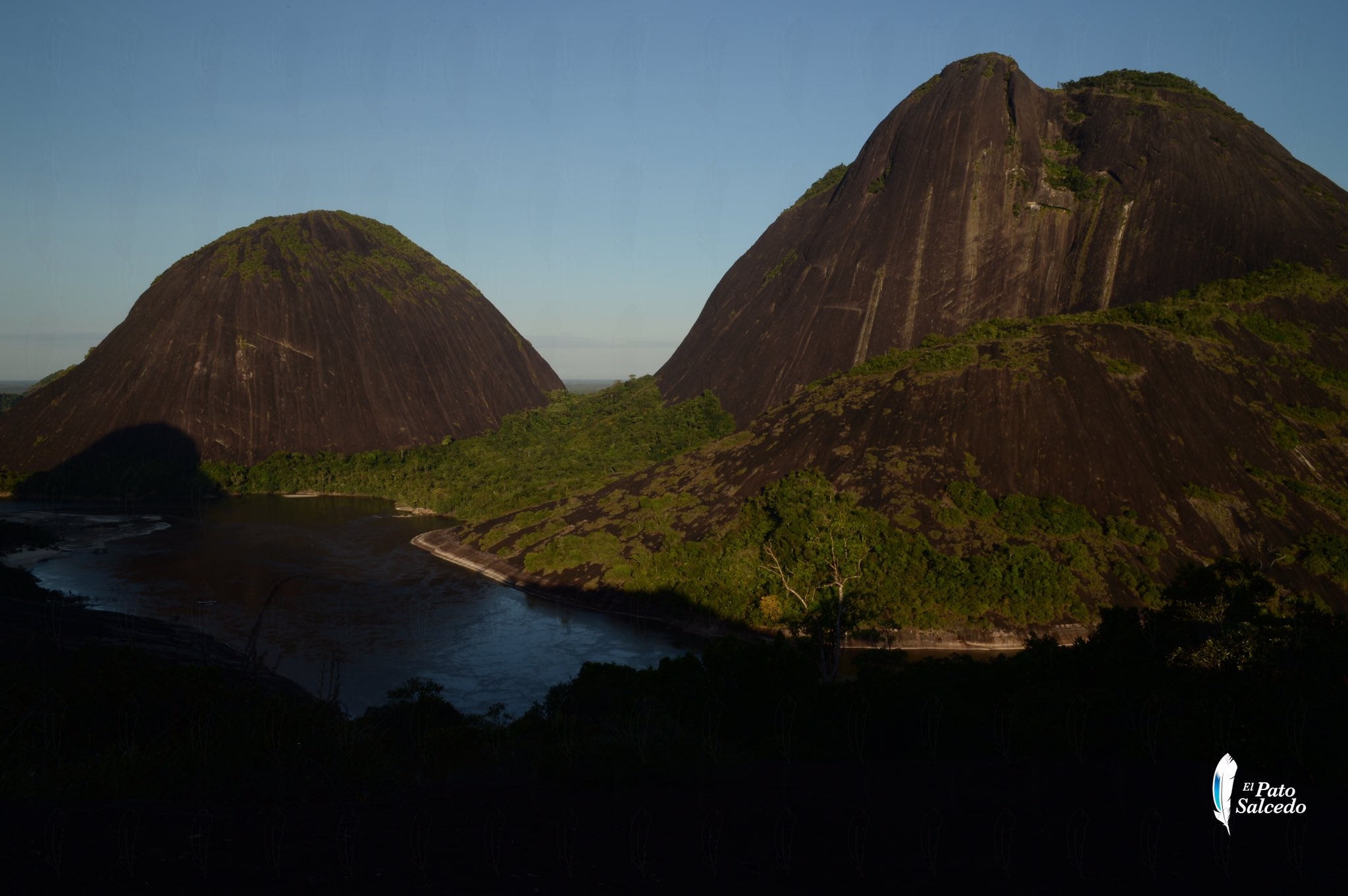 Al de la derecha lo llaman Pajarito; al de la izquierda, Mono; y en la base de este último, esa sombra que se asoma con el amanecer corresponde al tercer cerro que bautiza este mágico lugar: Mavicure. El rio que corre en la parte baja, es Inírida..