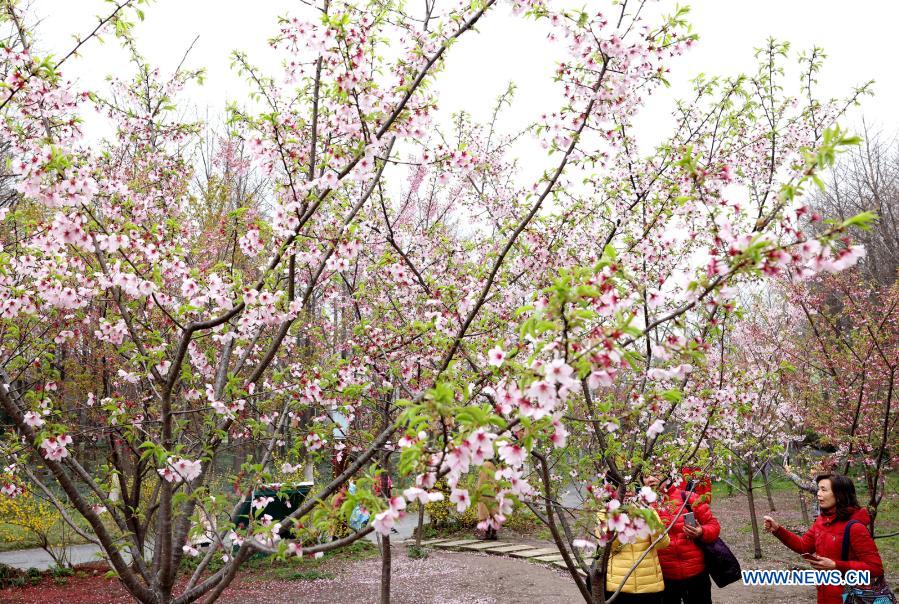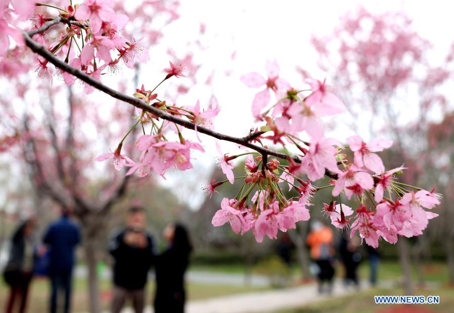 SHANGHAI, 12 marzo, 2021 (Xinhua) — Turistas observan flores de cerezo en el Parque Gucun, en Shanghai, en el este de China, el 12 de marzo de 2021. El Festival de la Flor de Cerezo de Shanghai 2021 inició el viernes. Más de 14.000 cerezos de 110 variedades se encuentran floreciendo. (Xinhua/Chen Fei)