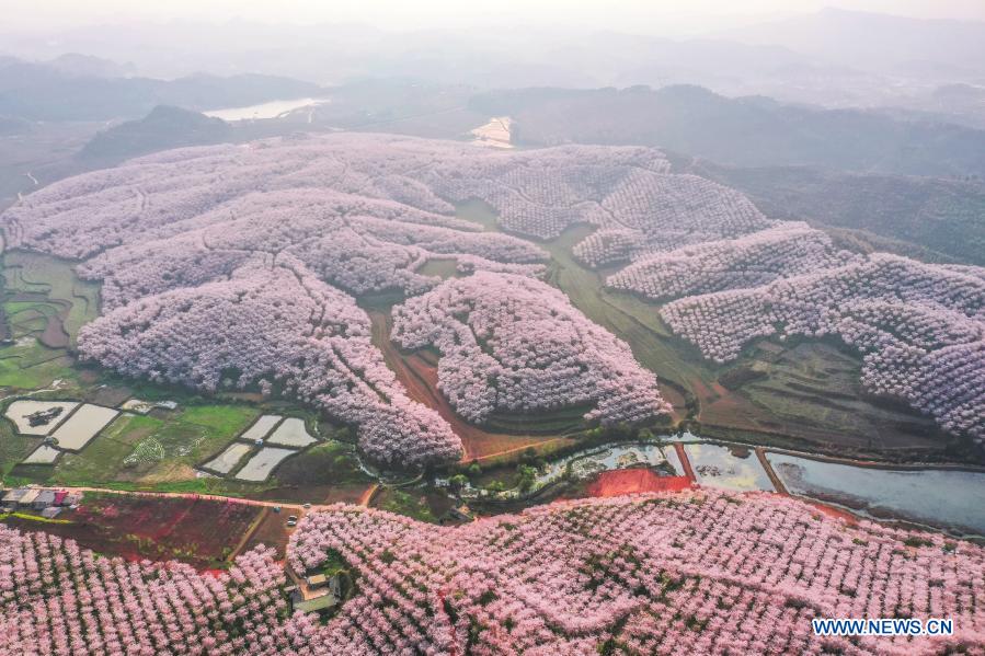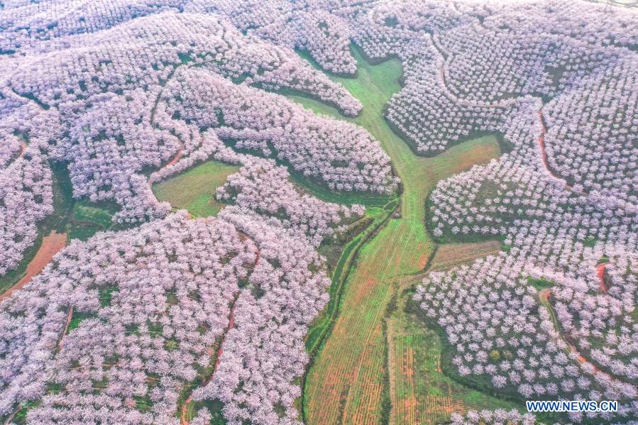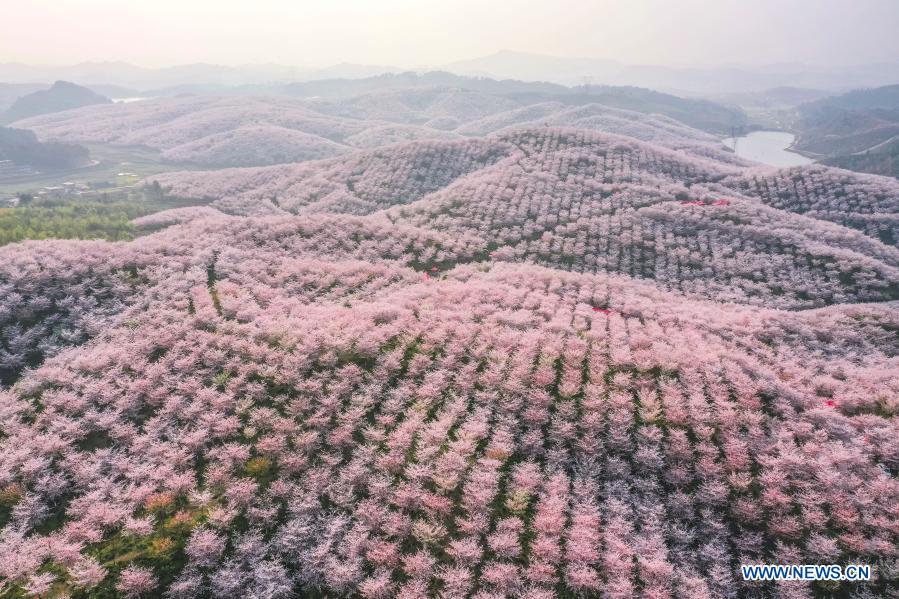 ANSHUN, 17 marzo, 2021 (Xinhua) — Vista aérea del 16 de marzo de 2021 de flores de cerezo en el jardín de los cerezos, en el municipio de Huangla, ciudad de Anshun, en la provincia de Guizhou, en el suroeste de China. El municipio de Huangla se ha aprovechado de la industria del turismo de las flores de cerezo para desarrollar la economía local y crear puestos de trabajo en las áreas cercanas. (Xinhua/Liu Xu)