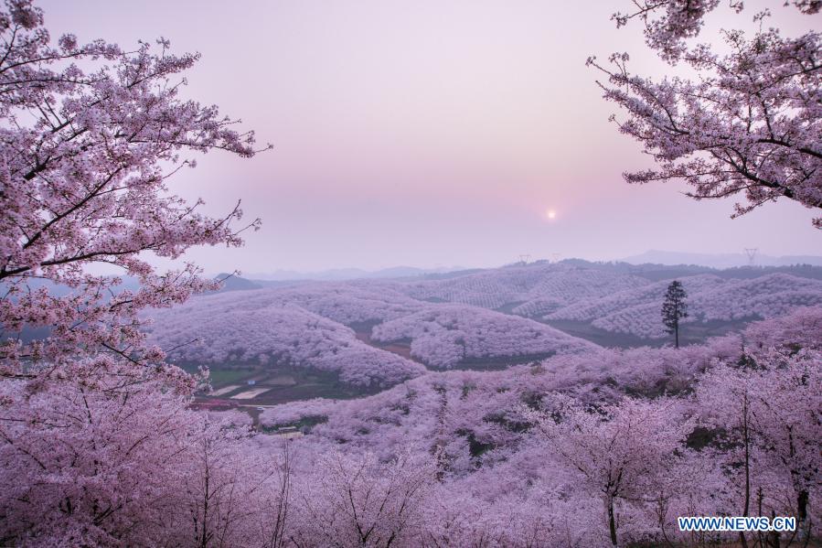 ANSHUN, 17 marzo, 2021 (Xinhua) — Imagen del 16 de marzo de 2021 de flores de cerezo en el jardín de los cerezos en el municipio de Huangla, ciudad de Anshun, provincia de Guizhou, en el suroeste de China. El municipio de Huangla se ha aprovechado de la industria del turismo de las flores de cerezo para desarrollar la economía local y crear puestos de trabajo en las áreas cercanas. (Xinhua/Liu Xu)