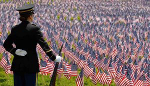 Soldado observa miles de banderas de Estados Unidos