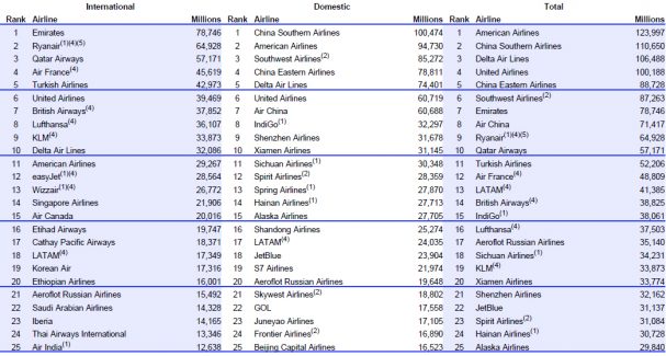 Del resto de líneas aéreas que forman parte del “top 25” del mundo, solo cinco son europeas. Se trata de Turkish Airlines (27,2 millones de viajeros), Easyjet (26,5), Air France (17), Wizzair (16,5) y Lufthansa (16,2).