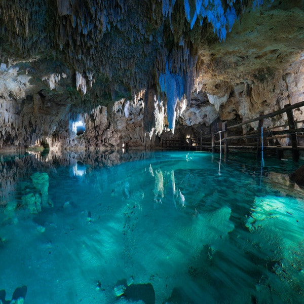 Uno de los principales destinos turísticos de Puerto Morelos son los cenotes de sus alrededores, esos pozos de agua dulce que podrás encontrar a cielo abierto o dentro de una cueva. Las antiguas civilizaciones indígenas usaban estos lugares como espacio de almacenamiento de agua, pero los viajeros de hoy han encontrado en estos regalos de la naturaleza una atracción sin igual; saltar desde las alturas hasta las profundidades de estas grutas de aguas cristalinas y vegetación exuberante es una experiencia única. En las proximidades de Puerto Morelos (a menos de una hora en coche) existen varios cenotes a los que podrás llegar desde la ciudad. Te recomendamos visitar el Cenote las Mojarras, Boca del Puma, Kin Ha, La Noria y Cenote Siete Bocas, muy cercanos entre ellos, perfectos para recorrer en un mismo día. O incluso acercarse a Aktun Ha, a apenas 90 kilómetros de Puerto Morelos