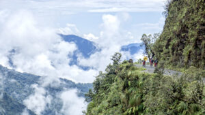 Mountain bikers riding the famous downhill trail "Road of death" in Bolivia
