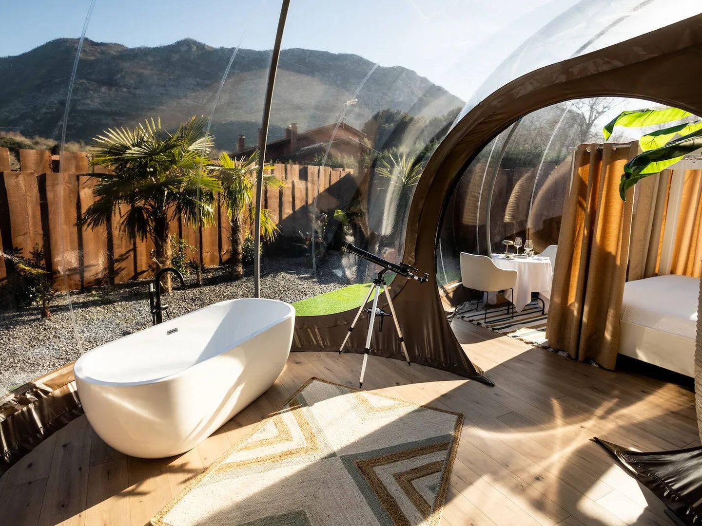 Burbujas hay de muchos tipos: las que proliferan en la sidra asturiana que acaba de ser declarada Patrimonio Cultural Inmaterial de la Humanidad por la UNESCO, las del mar o esas que salen a flote en los codiciados jacuzzis, un extra de lujo que muchas parejas buscan en una escapada de relax. Ahora, la corriente del río Sella, en su travesía entre los Picos de Europa y el mar Cantábrico, crea un oasis en plena naturaleza en un hotel boutique que invita a sus huéspedes a dormir bajo las estrellas en cápsulas exclusivas que ofrecen el máximo confort.