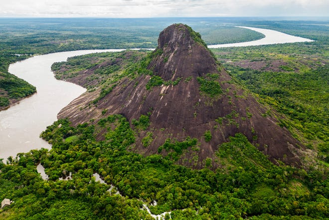 Vista del Cerro Mono Mavicure en la comunidad El Remanso, en el departamento de Guania el 11 de agosto de 2024. Los Cerros Mono Mavicure son un grupo de tres monolitos -Pajarito, Mono y Mavicure de 712, 480 y 170 metros de altura, respectivamente- ubicados en el sureste de Colombia, a 50 km al sur de la ciudad de In’rida.LUIS ACOSTA, AFP Vía Getty Images