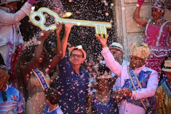 El Rey Momo Kaio Mackenzie (derecha) y la Reina del Carnaval Thuane Werneck (izquierda) reciben la llave de la ciudad del alcalde de Río de Janeiro, Eduardo Paes (centro), durante la ceremonia oficial de apertura del Carnaval en Río de Janeiro, Brasil, el 28 de febrero de 2025.Mauro Pimentel, AFP vía Getty Images