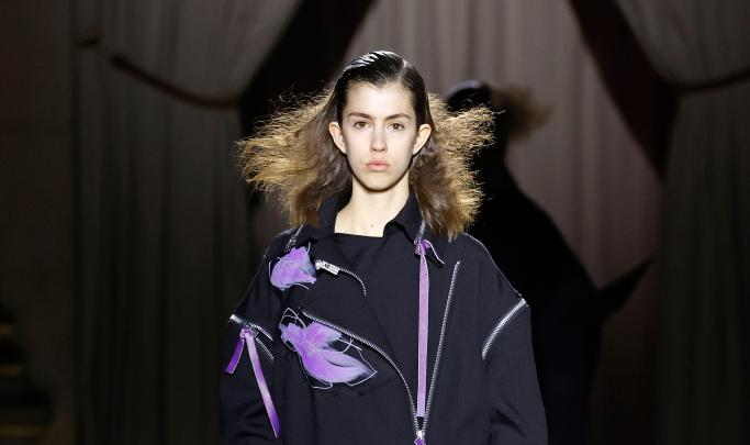 PARIS,– Imagen del 7 de marzo de 2025 de una modelo presentando una creación de las colecciones listas para usar Otoño/Invierno 2025-2026 de Yohji Yamamoto durante la Semana de la Moda de París, en París, Francia.