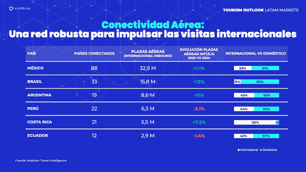 Para descubrir las claves que están marcando el turismo internacional en seis potencias regionales de América Latina (México, Costa Rica, Argentina, Brasil, Perú y Ecuador), Mabrian llevó a cabo un análisis cruzado de datos consolidados de demanda turística con la conectividad aérea prevista, para identificar patrones de demanda tanto estructurales como cíclicos, y explorar las oportunidades y los desafíos futuros para cada destino.