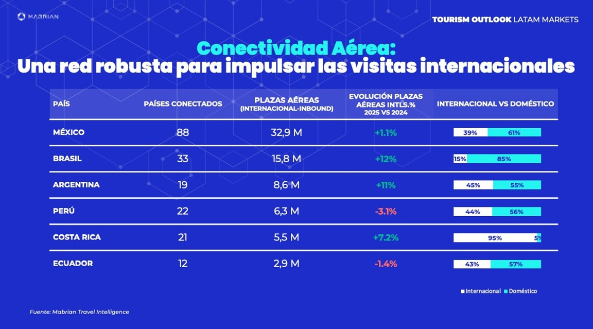 Para descubrir las claves que están marcando el turismo internacional en seis potencias regionales, como México, Costa Rica, Argentina, Brasil, Perú y Ecuador, Mabrian llevó a cabo un análisis cruzado de datos consolidados de demanda turística con la conectividad aérea prevista, para identificar patrones de demanda tanto estructurales como cíclicos, y explorar las oportunidades y los desafíos futuros para cada destino.