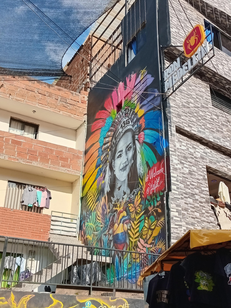 Comienza se suben a pie, y aparece aquí y acullá tanto en pinturas, o en graffitis, que reproducen momentos bélicos, o representan la perspectiva paisajística de la zona. Resaltan asimismo en diversos murales, entre ellos el gigantesco de la Pachamama y en las tiendas de souvenirs con su llamativa artesanía. Sólo el gris de la tristeza se aposenta en el museo donde, en las paredes, se cuenta la angustiante historia de Comuna 13.