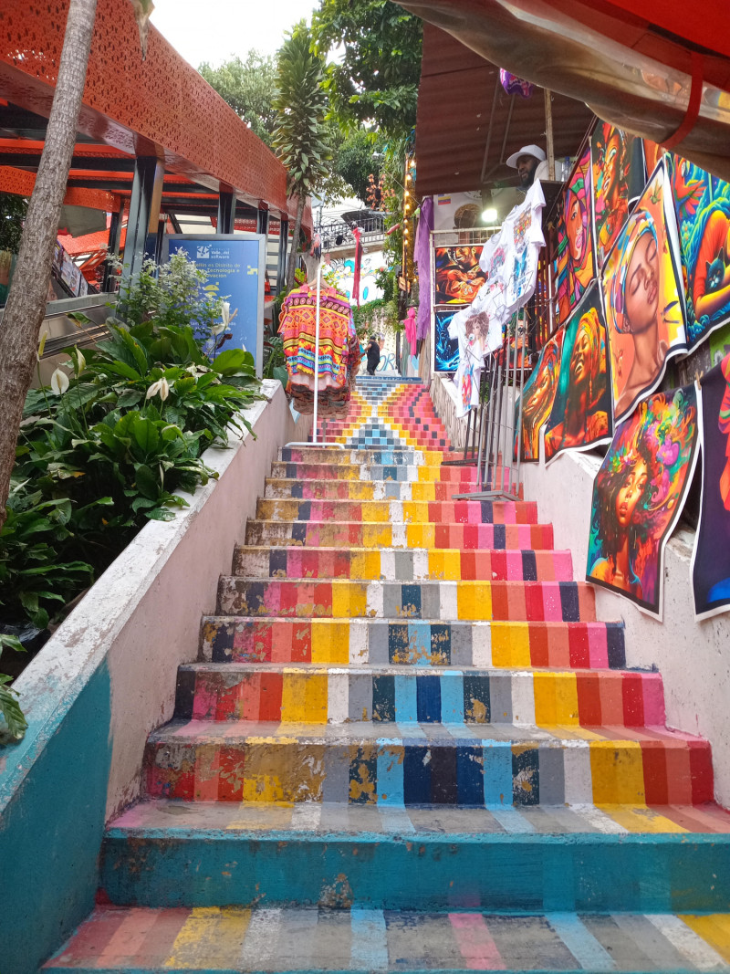 No fue así. Sólo es parte del trayecto. El resto se sube por escaleras comunes que se elevan inmisericordes para el peatón, o, a ratos, puede hacerse si se prefiere por la empinada vía paralela cuando ésta existe. La fatiga puede hacer mella, pero se olvida ya que, desde el primer momento impacta el colorido que abunda por doquier.