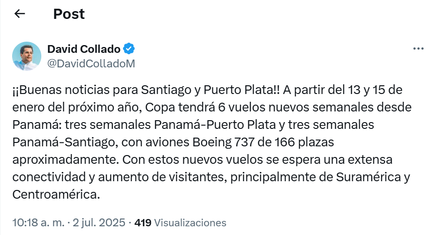“¡¡Buenas noticias para Santiago y Puerto Plata!! A partir del 13 y 15 de enero del próximo año, Copa tendrá 6 vuelos nuevos semanales desde Panamá: tres semanales Panamá-Puerto Plata y tres semanales Panamá-Santiago, con aviones Boeing 737 de 166 plazas aproximadamente. Con estos nuevos vuelos se espera una extensa conectividad y aumento de visitantes, principalmente de Suramérica y Centroamérica”, expresó el ministro Collado.