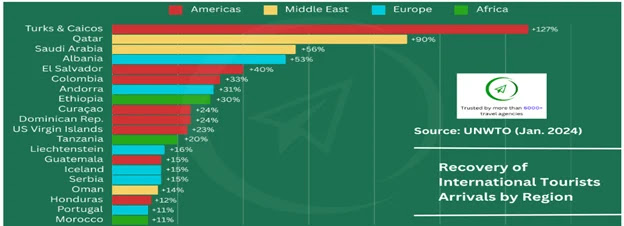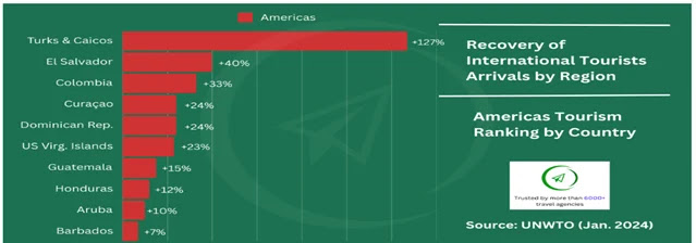 Las dos gráficas siguientes (#3 y #4) presentan el cálculo de ONU Turismo respecto al grado de recuperación del flujo turístico en el periodo 2019 y 2024. Las gráficas revelan que nuestro país estuvo entre los de más rápida recuperación, pero hubo otros destinos, como Islas Turcas y Colombia, que se nos adelantaron. Aquí se ha manejado la noción de que lideramos el mundo en eso, pero las gráficas de ONU Turismo no apoyan esa versión. Tal vez sea porque el límite superior del periodo cubierto fue enero 2024, pero conviene de todos modos ponderar lo reportado por ONU Turismo. A favor nuestro está lo que reporta la gráfica #3, que las Américas fue la región de más rápida recuperación y, según la gráfica #4, nosotros figuramos como los campeones (a juzgar por el volumen de turistas requerido para lograr la recuperación).