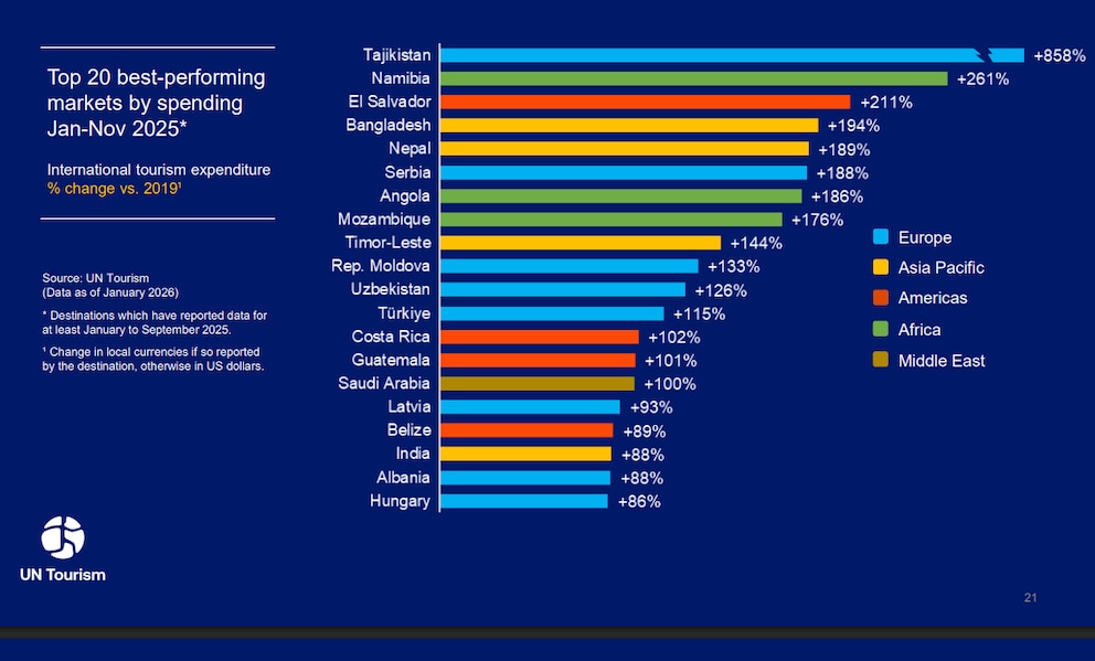 El país muestra un incremento del 92% en la llegada de turistas internacionales respecto a 2019, ubicándose en el tercer lugar mundial entre los destinos con mayor crecimiento, solo superado por Bután (+198%) y Qatar (+138%).