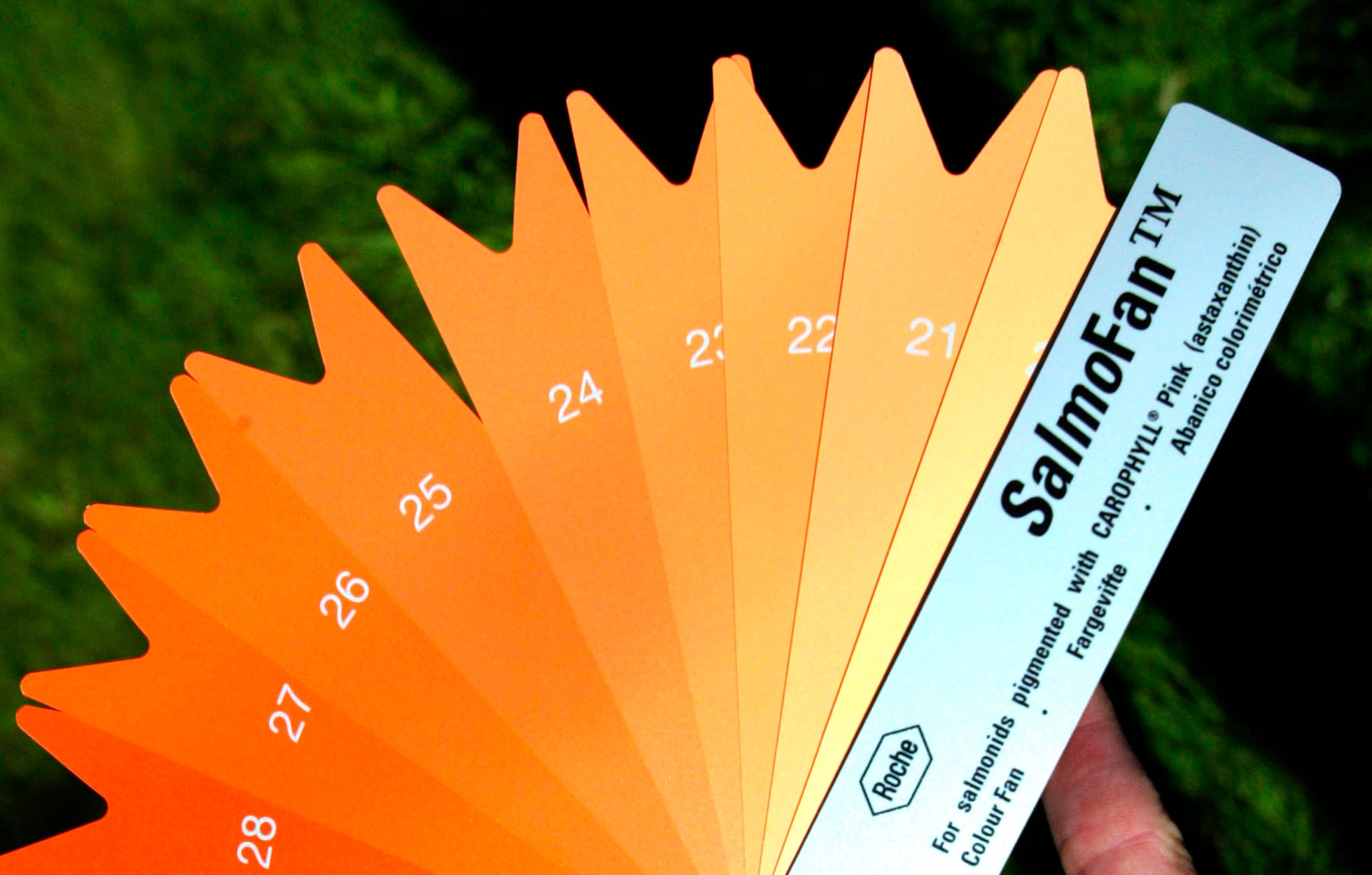 La responsable de este tono es la astaxantina, un carotenoide que el salmón salvaje obtiene de su dieta en libertad, y el que consumimos en mayor proporción obtiene del pienso que le suministran durante su reclusión marina. Es un naranja con mucho más sex appeal que el del salmón salvaje e incluso existe una herramienta de la industria para medir el tono del filete: el Salmofan. ¡Pantone salmónido!